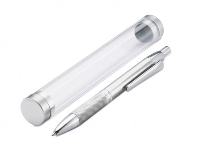 Pix din aluminiu anodizat cu mecanism prin apăsare cu garnituri din crom lucios. Prezentat într-o cutie tubulară din plastic. Pastă albastră.