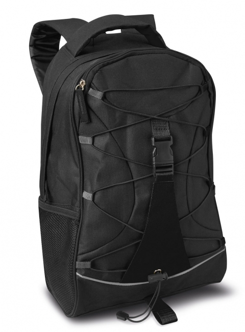 Rucsac negru cu culoare contrastantă din poliester 600D și șnur decorativ pe panoul frontal. Buzunare laterale pe ambele părți.