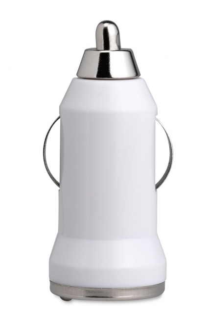 Încărcător USB pentru mașină din Abs și aliaj de aluminiu cu indicator cu led roșu, livrat în cutie argintie din carton.
