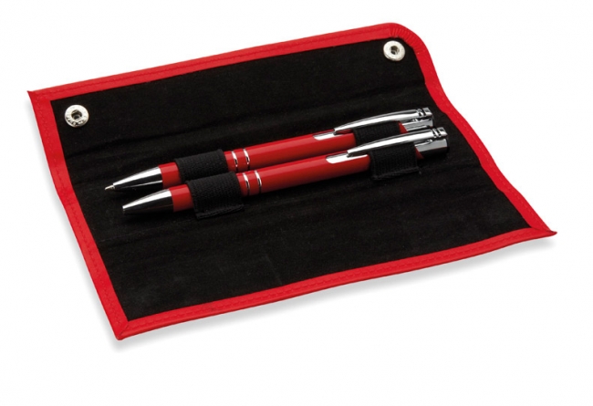 Set de scris in husa asortata. Include pix din aluminiu cu deschidere prin apasare si reion mecanic. Mina albastra.