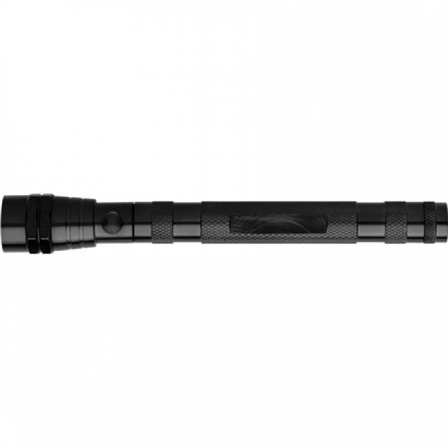 Aluminium torch with three led lights, telescopic function and flexible hat, includes a strong magnet on each end, has a flat area on the handle for printing purposes.