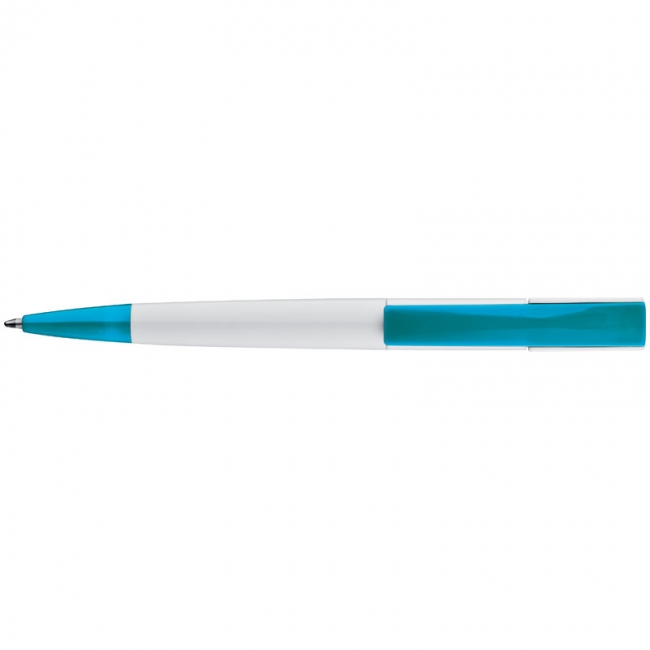 Pix din plastic cu mecanism de răsucire cu corp alb, accesorii colorate și clip mare colorat. Personalizarea vă recomandăm prin tampografie sau prin UV.