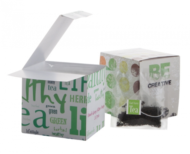 Pyramid tea bags in custom made paper box with your graphics. Contains 20 grams (10 bags) of Earl Grey tea. MOQ: 100 pcs.