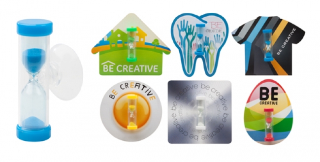 Plastic, 3 minutes sand timer with matching colour sand and suction cup holder. Customise it with paper insert!