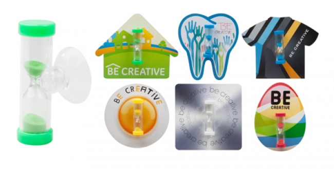 Plastic, 3 minutes sand timer with matching colour sand and suction cup holder. Customise it with paper insert!