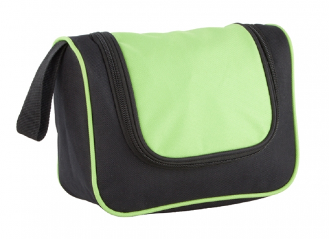 Zipped cosmetic bag with inner mesh pocket and plastic hook. 600D polyester.