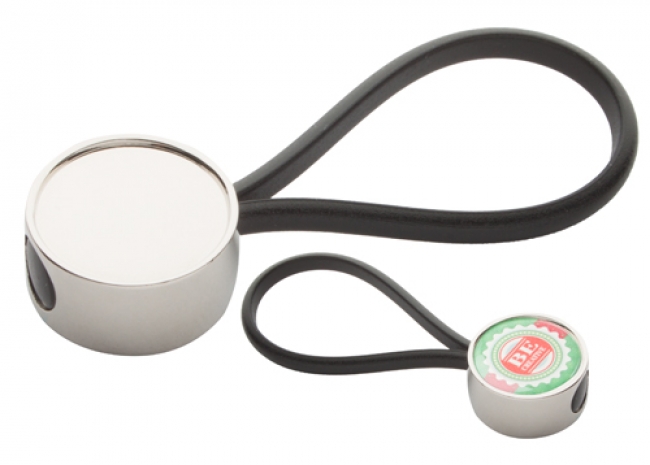 Round shaped metal keyring with black rubber loop and epoxy dome. Price includes epoxy dome printing. MOQ: 100 pcs.