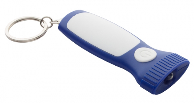 Mini flashlight with 1 LED, keyring and printable surface. Delivered with button cell battery.