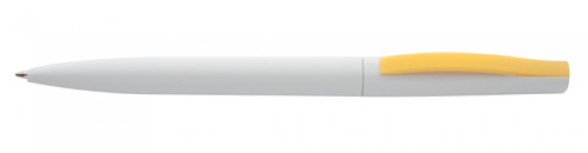 Plastic ballpoint pen with white barrel and coloured clip. With blue refill.