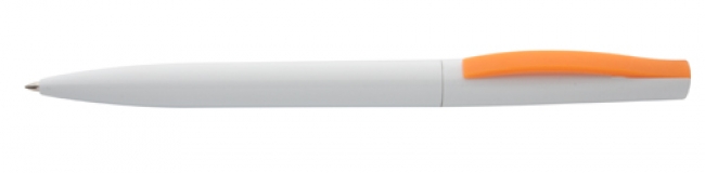 Plastic ballpoint pen with white barrel and coloured clip. With blue refill.