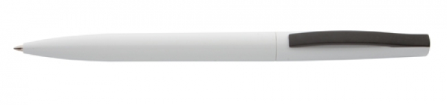 Plastic ballpoint pen with white barrel and coloured clip. With blue refill.