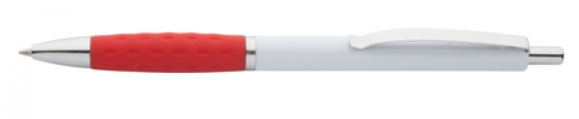 Plastic ballpoint pen with coloured rubber grip, metal clip and tip. With blue refill.