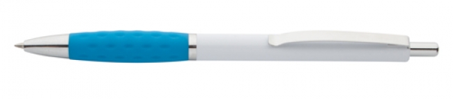 Plastic ballpoint pen with coloured rubber grip, metal clip and tip. With blue refill.