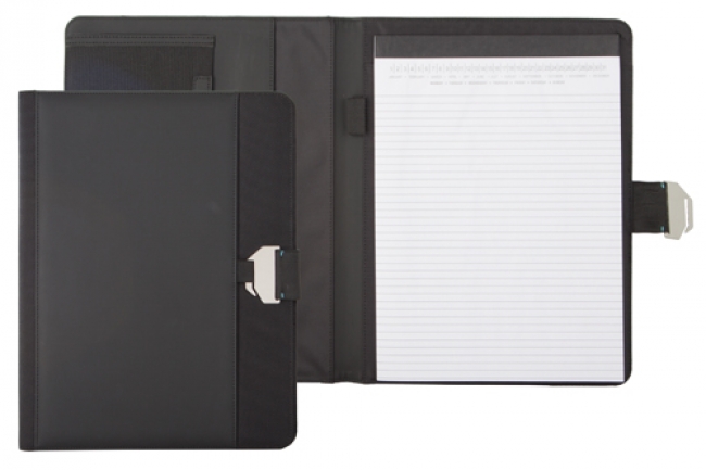 A4 sized, PU leather and polyester document folder with 20 sheets notebook, metal buckle, pen and business card holders.