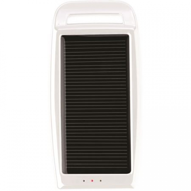 Plastic solar charger with a carry handle on top and three LED lights on the bottom, including a cable with different attachments.