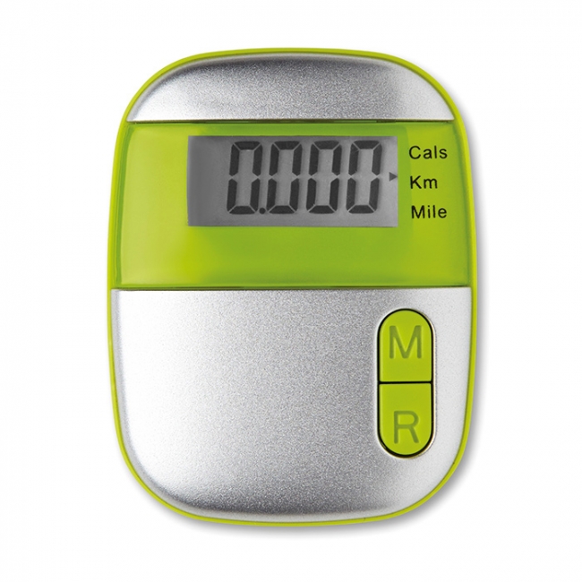 Pedometru cu clip de prindere în carcasă din plastic ABS. Măsoară numărul de paşi, distanţa ( mile sau kilometri ) şi caloriile. Include 1 baterie de tip celulă.