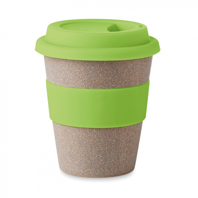 Cană cu perete simplu confecţionată din fibră de bambus, cu capac şi manşon de prindere din silicon. Capacitate 350 ml.