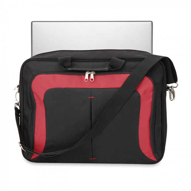 Geantă modernă din combinaţie de poliester 600D/420D, cu compartiment interior pentru laptop de 17 inch şi buzunar frontal cu fermoar. Prevazută cu baretă de umar detaşabilă şi reglabilă.