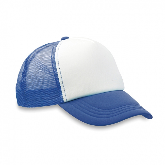 Şapcă din poliester cu 4mm material spumă la spate.5 panele şi închidere cu capsă.