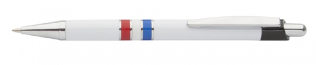 Plastic ballpoint pen with solid white barrel, chrome clip and tip, and coloured decoration rings. With blue refill.