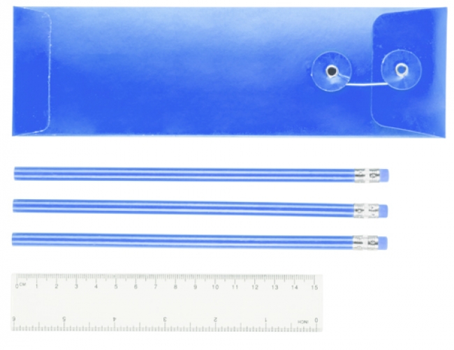 4 pc pencil set with 3 wooden lead pencils and 15 cm plastic ruler. In matching colour paper envelope case.