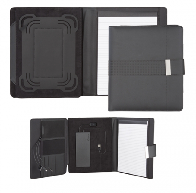 PU leather document folder with universal iPad® holder, 5000 mAh power bank and 20 sheets notepad. With USB charger cable with mini USB, Lightning and 30-pin Apple® dock connectors.