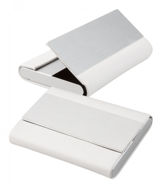 PU leather covered, metal business card holder with brushed aluminium plate.
