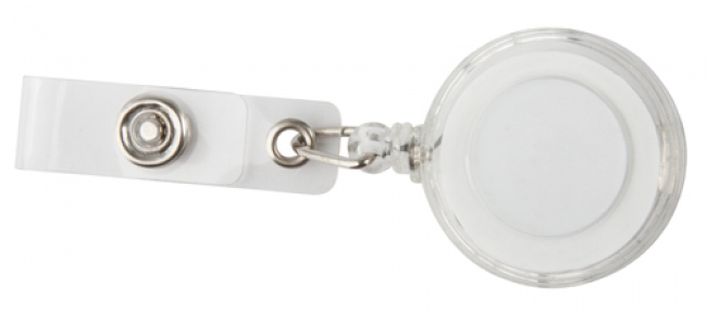 Plastic pass holder with press-stud closure, telescopic line and metal clip.
