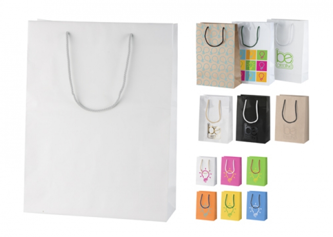 Custom made paper shopping bag with polypropylene handles. With CMYK or spot colour (up to 5 Pantone colours) imprint. MOQ: 500 pcs.