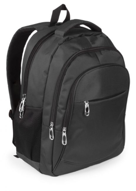 600D nylon backpack with multiple zipped compartments, padded laptop pocket, back and shoulder straps.
