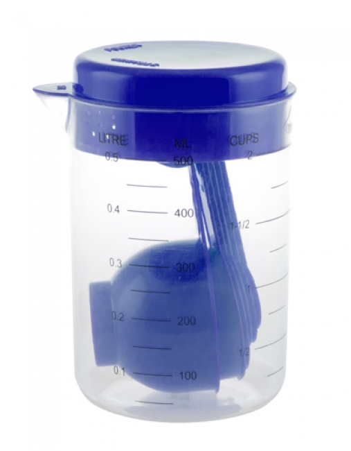 Plastic measuring set with cup (500 ml) and 6 matching colour spoons.