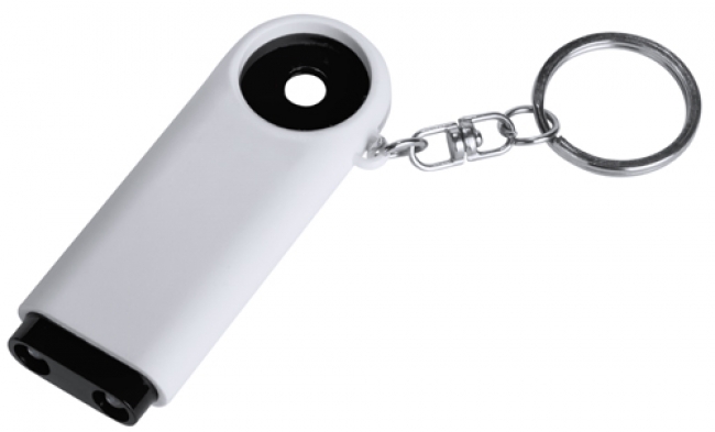 Plastic keyring with shopping trolley coin and 2 LED flashlight. With button cell batteries.