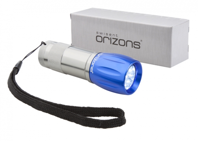 Aluminium, 9 LED flashlight with wrist strap. Operates with 3 of AAA batteries, without battery. Orizons brand product.