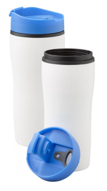 Double wall, white plastic thermo mug with coloured drinking lid. 450 ml.