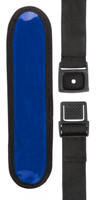 Reflective, visibility band with elastic strap and 1 LED light. Made of polyester and PVC. With button cell batteries.