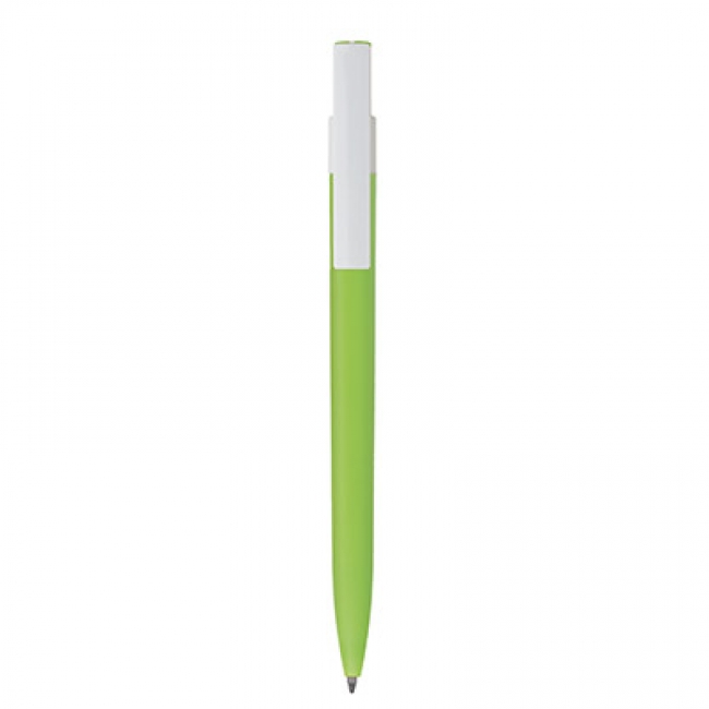 Plastic retractable ballpoint pen with coloured barrel and white clip.
