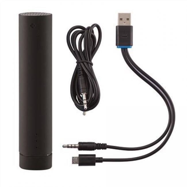 2W speaker that also supports your phone while watching a movie or listening to some music. It's powered by a 3500mAh lithium battery with an output of 1A that can be used to charge your mobile device simultaneously.