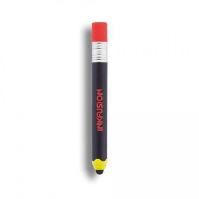 Small ballpoint inside pencil shaped casing with stylus tip.