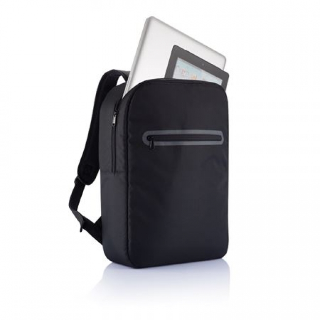 300D polyester laptop backpack with 1 main compartment which has a separate tablet pocket and an organizer.