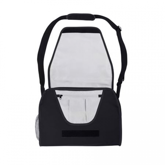 Trendy 600D polyester exhibition bag with 1 main compartment covered by a padded flap, pen loops, phone pocket, mesh pocket on the side and the option to slide it over a trolley system.