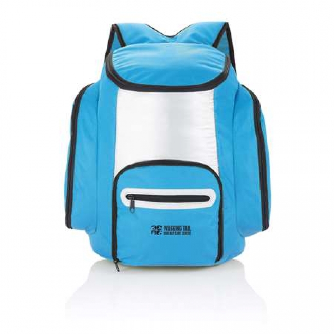 600D cooler backpack with silver inside to keep all your food and beverage cold. On the front there’s one additional pocket with printed color detail around the zipper for storing your other belongings.