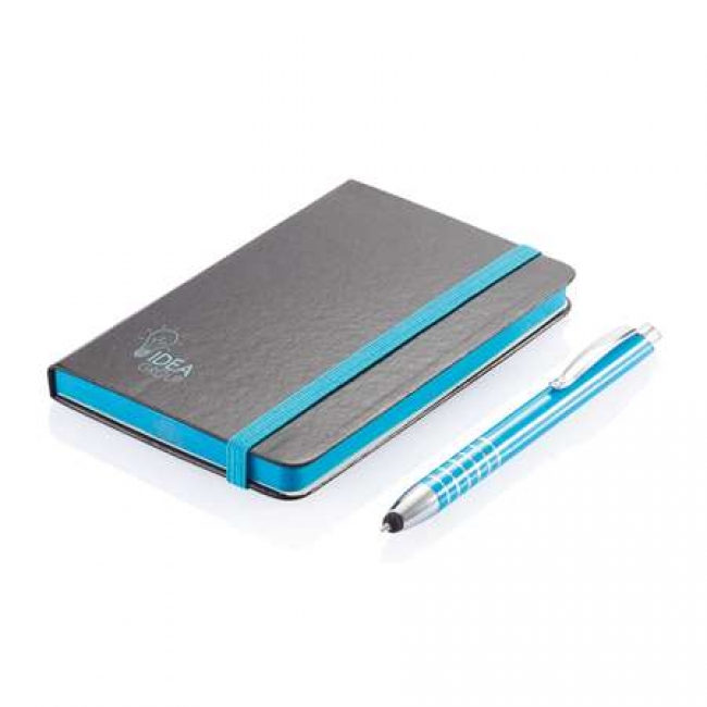 A6 hardcover notebook with 80 pages of 80g with matching colour sides and elastic band. Including aluminium pen with ballpoint and stylus tip.