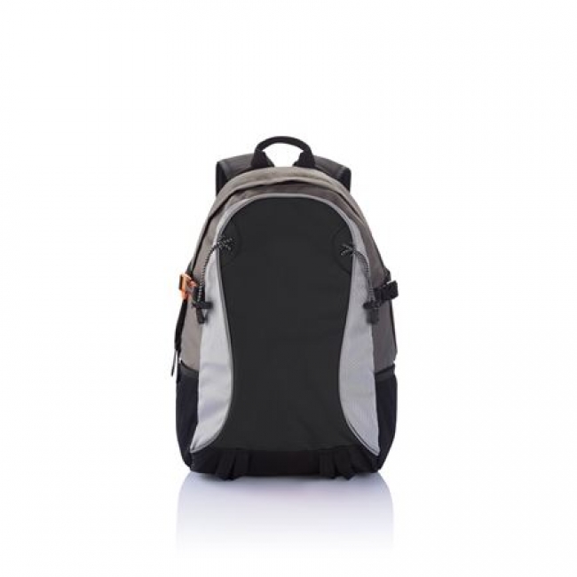 600D polyester and 420D jacquard outdoor backpack with one zippered main compartment, mesh pockets, reflective piping and an integrated whistle in case of emergencies.