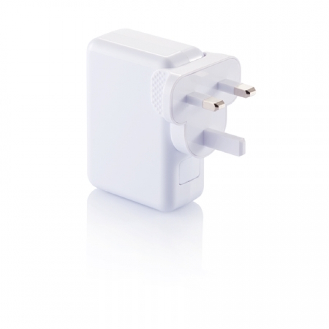 Portable 4 port USB travel plug to charge all your devices when on the road. The powerful 3.1A output gives you enough power to charge all your devices at the same time. AC Max 240V/350mA, USB Max 5.25V/3.1mA DC. Comes with four different plugs. Packed in pouch.