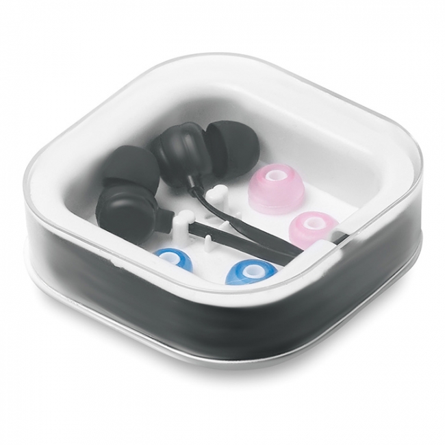 Căşti audio cu husă din silicon şi microfon, ambalate în cutie din plastic cu loc pentru aşezat cablul de 120 cm. Setul include şi 2 huse de rezervă de dimensiune diferită.