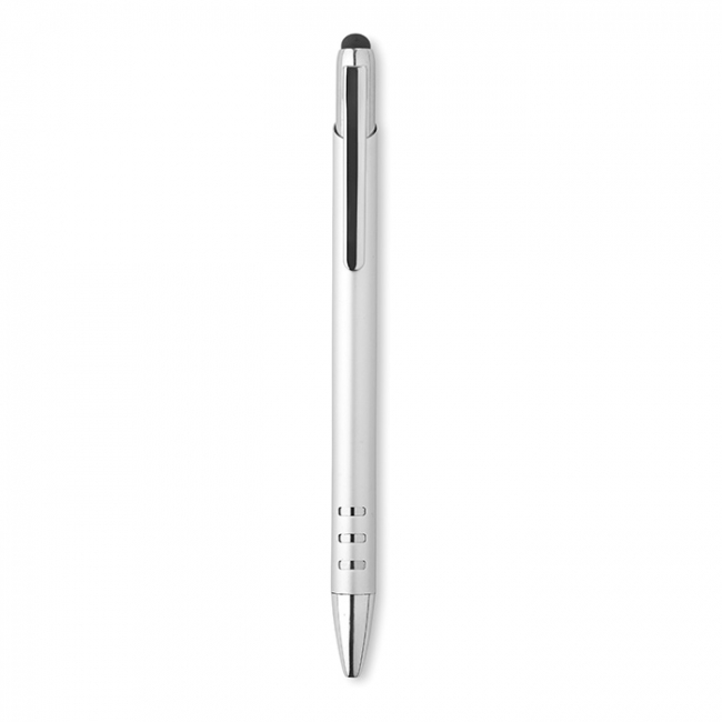 Pix din aluminiu, cu capăt moale pentru ecran tactil şi corp lucios cromat. Mină albastră.