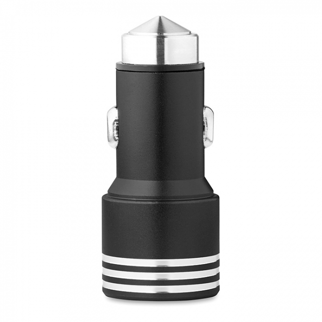 Încărcător auto din aluminiu, cu 2 hub-uri şi ciocan de urgenţă.