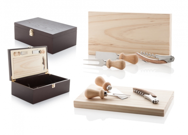 Cutie din lemn pentru 2 sticle de vin, cu 2 cuțite pentru brânzeturi, 1 tirbușon și un tocător de lemn. Se livrează fără sticle de vin.