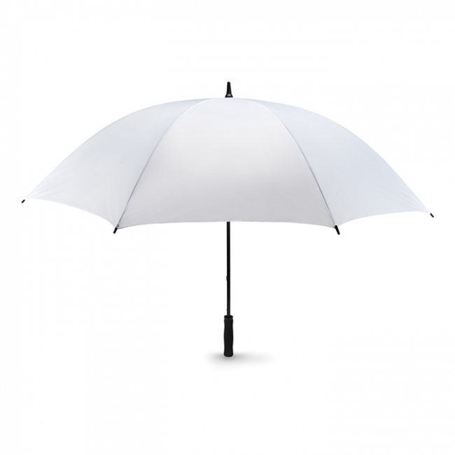 Umbrelă golf rezistentă la vânt cu deschidere manuală, 8 panele de 27" ( 76 cm ) lungime, ax și spițe din fibră de sticlă, vârf și terminații din plastic negru. Mâner drept din material spumos EVA. Închidere manuală. Material poliester 190T. Diamteru la deschidere 124 cm.