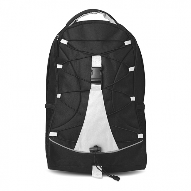 Rucsac negru cu față colorată și șnur de decor. Buzunare laterale din plasă. Material poliester 600D.